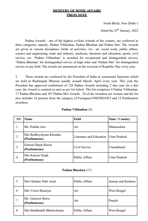 Padma Awards 2022 | Shri ghulam nabi azad public affairs jammu and kashmir · shri victor banerjee art west bengal · ms. Among the 128 recipients of the honours this year are veteran actor victor banerjee . In 2022, the president has approved conferment of 128 padma awards including 2 duo case ; India's first chief of defence staff general bipin rawat and former uttar pradesh chief minister kalyan singh have been . Gurmeet bawa (posthumous), art, punjab ;